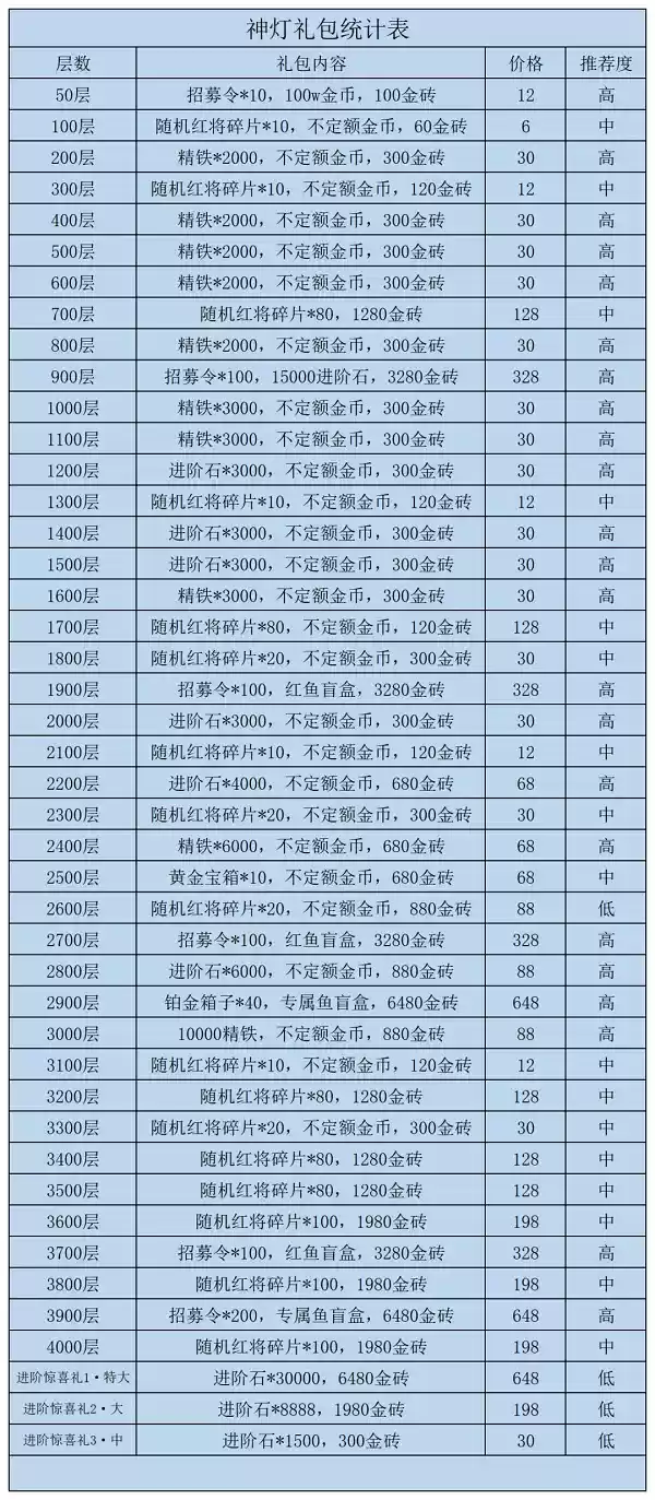 推荐度为中的,都是中氪玩家不值得氪,氪金大佬可以考虑氪的礼包。