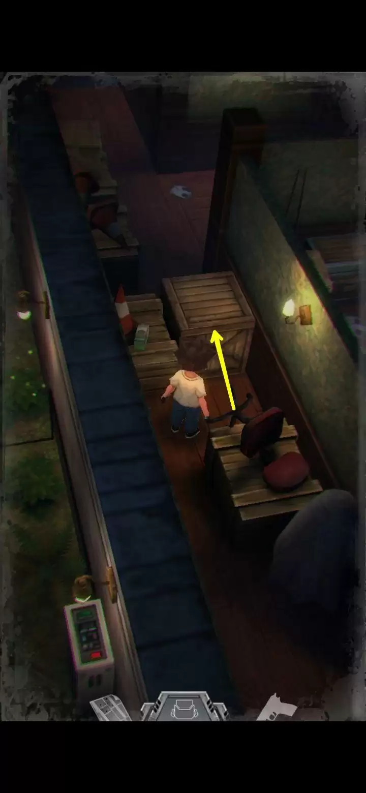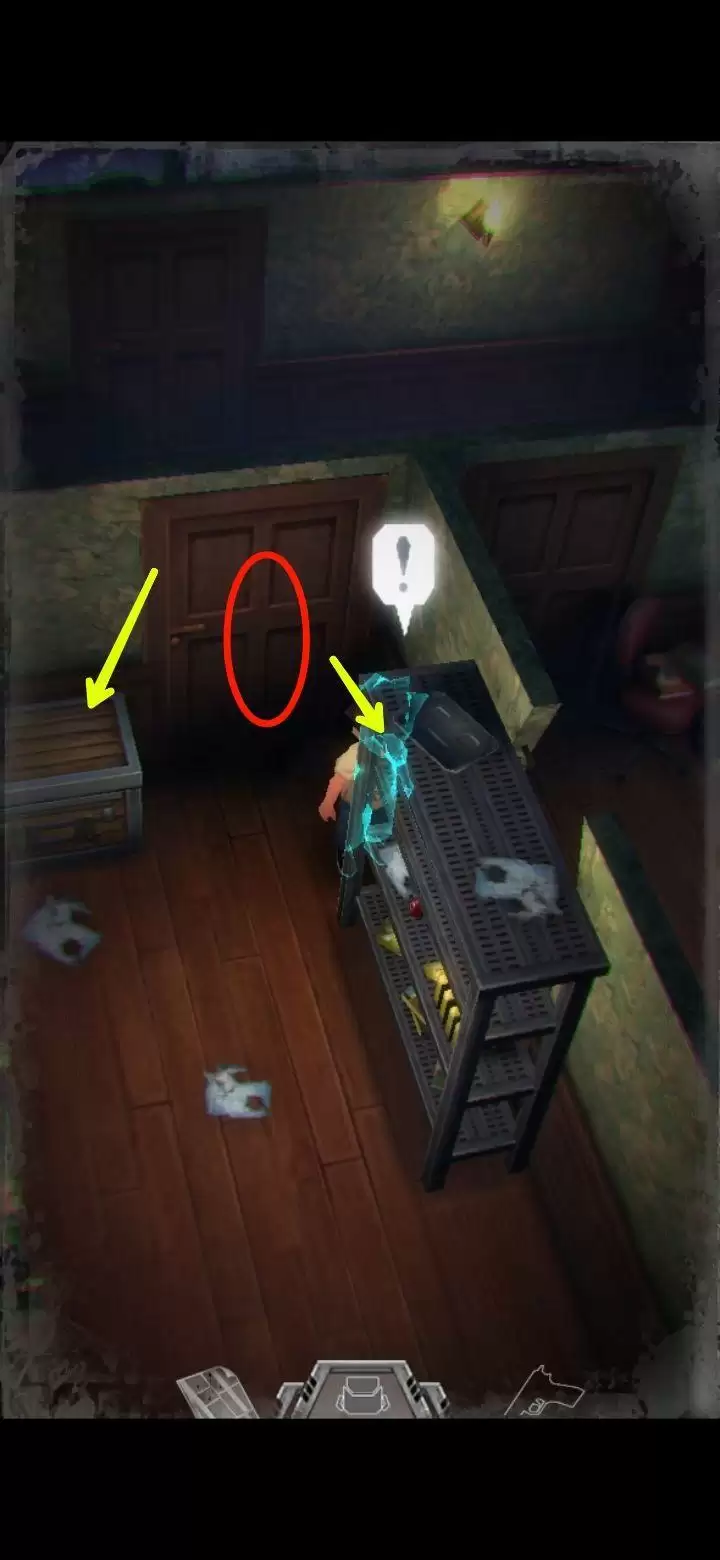 箱子是储物箱,可以存储物品(男主的背包容量有限,可以把暂时用不到的东西装进储物箱)。杂物间的门需要钥匙,用红圈标识。走到如图所示的位置,按照箭头的方向面向这个铁制置物架,松开***,长按屏幕任意处就可以朝男主面向的方向推动物品,把架子推开后,从墙壁空缺处走进另一个房间。
