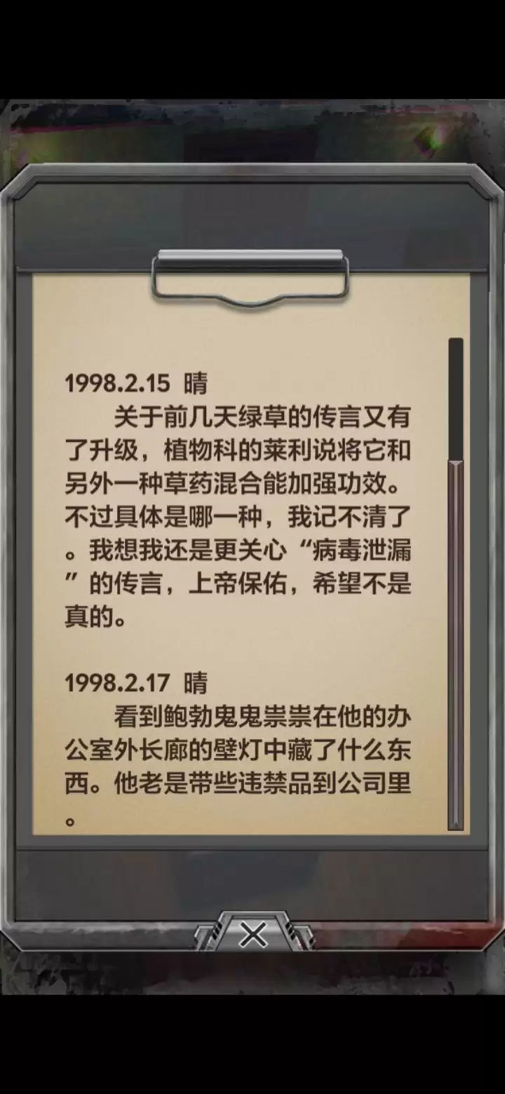 地上的箱子向任意方向推动,拾取箱子下面的杂物间钥匙;柜子里拾取9mm弹夹;门口的纸箱上放着 管理员日记 二