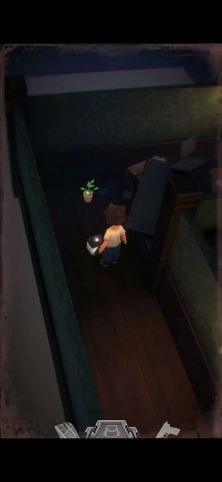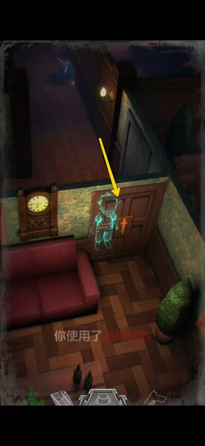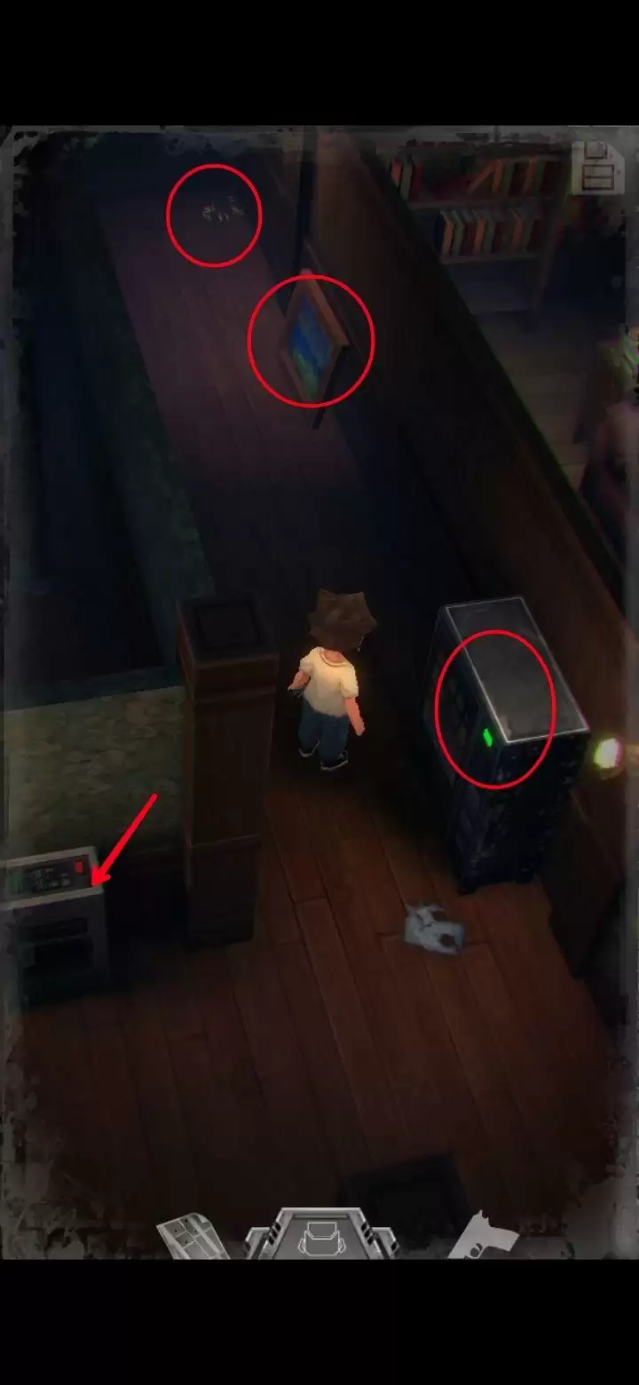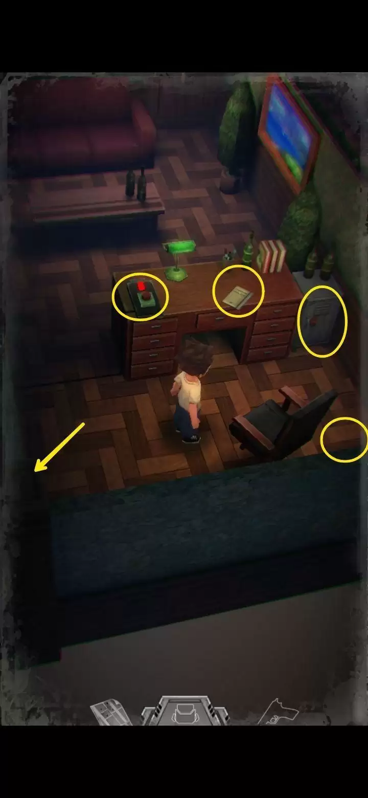 桌子上有个不能按的按钮先记住。鲍勃日记里提到645是别处的密码,保险柜密码是153(办公室内的1个沙发,5个酒瓶,3幅画),拾取手枪,地上拾取弹夹。打开背包,组合弹夹和手枪,装备手枪,一次最多装填16枚,每次打完怪记得及时补充。打怪技巧:射击时可以长按屏幕瞄准,然后一直轻点射击,或者点击一下屏幕下方的手枪标志瞄准(再次点击就会取消瞄准),然后多次点击屏幕其他地方进行射击,或是直接点击怪物进行手动瞄准。(瞄准后可以一直射击,不用瞄一次打一次,移动会中断瞄准状态,需要再次瞄准才能射击)箭头指的地方有一扇门,走进去。有怪出来,不要惊慌,拉开距离以后瞄准(我推荐点下方的手枪标志),射击,近距离被抓到会掉血,不贴脸就没事,非常简单,怪“啊!”的惨叫一声之后就不要再开枪了,已经死了,注意节省弹药。有的怪死了以后会掉亮闪闪的代币,记得踩踩尸体。