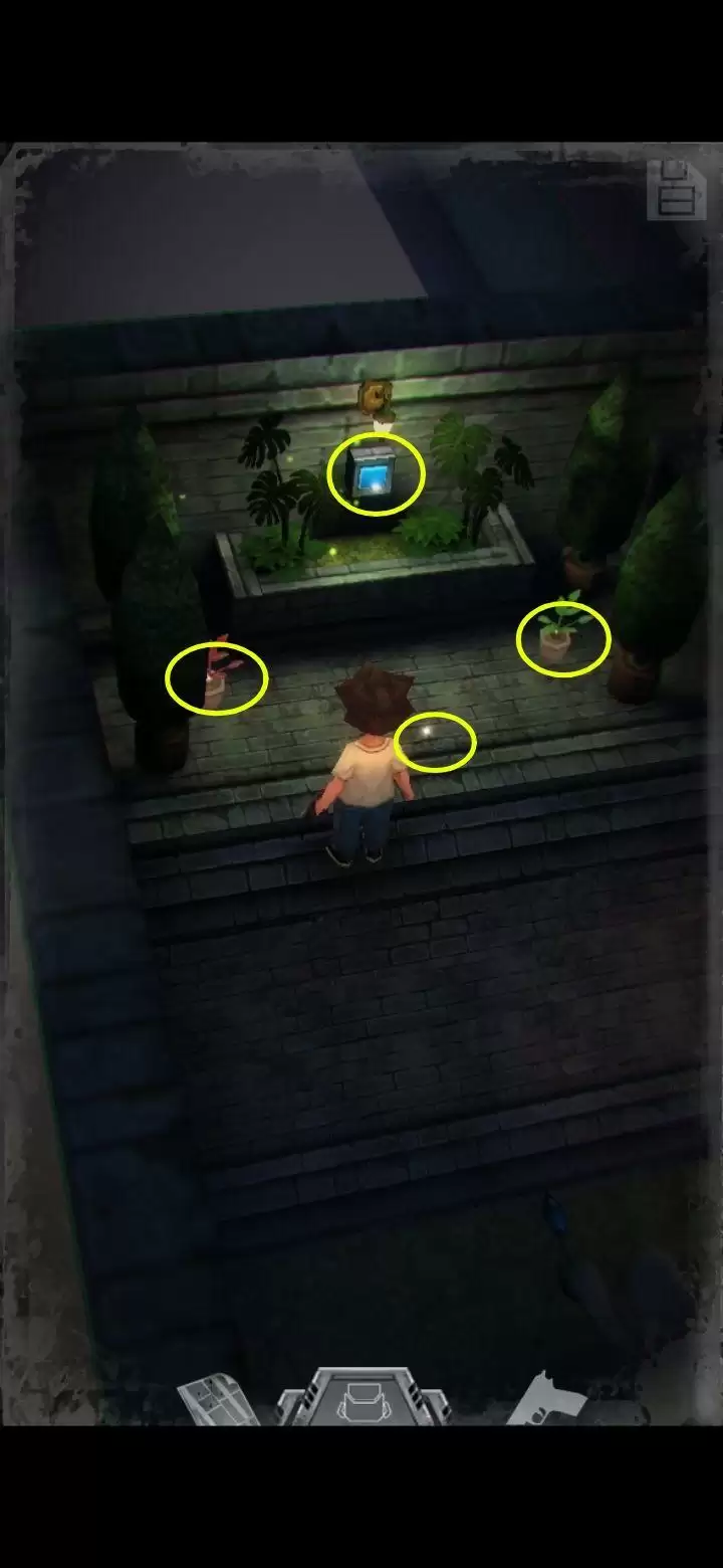 左边有一棵小疗伤药,上面的机关需要四角手轮,管理员日记里提示手轮在洗手间,办公室里的酒瓶不让人动(与密码有关)。地上坐的是个怪,这游戏里除了主角任何人形生物都是怪,所以不要在他旁边晃悠的时间太长,尽量最后拿箱子上的钥匙,拿了怪会站起来咬你,不要惊慌,拿完跑出去就可以。