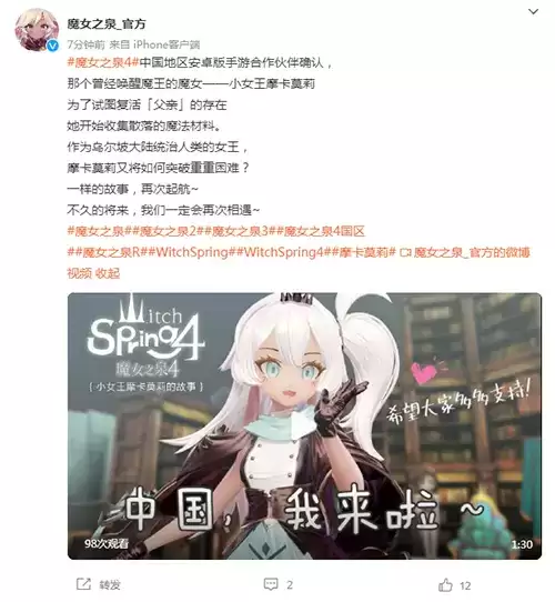 4月21日魔女之泉正式微博发布最新动态,宣布手游已经有国区代理,目前游戏正在紧锣密鼓的筹备当中,预计不久之后将会正式与玩家见面。这款由韩国游戏开发公司Kiwiwalks制作游戏第一代名字叫做《春巫》,从第二代开始成为《魔女之泉》。