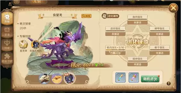 龙骑也可以通过进化随机强化某一方面的属性,或穿戴装备获得基础属性和附加属性来进行培养。随着龙骑的进阶,龙骑在外形上也会展示出不同的变化。