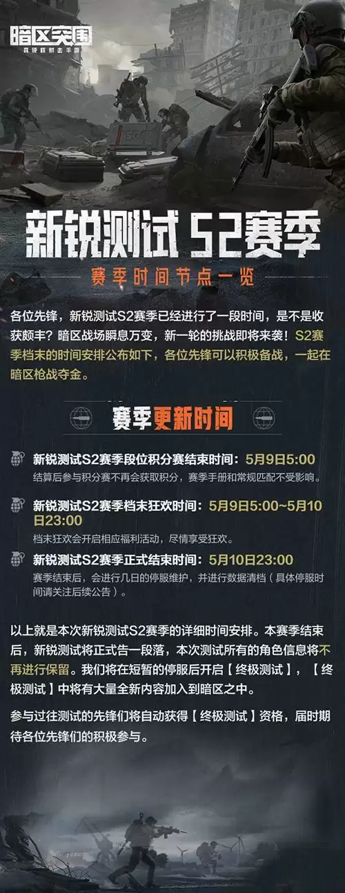 《暗区突围》新锐测试结束时间已经确定,同时对于S2赛季的信息时间进行了安排,游戏在赛季结束之后会对游戏进行优化调整,之后会对游戏进行终极测试,参与过新锐测试的玩家都自动获得资格,下面一起来看下具体内容。