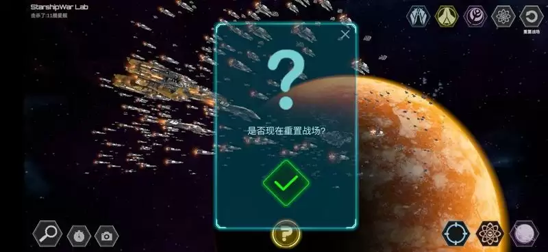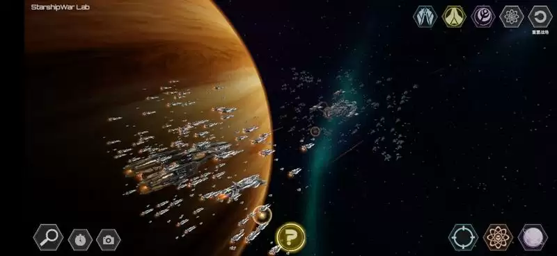 上面右边五个依次为:操控蓝方战舰、操控黄方战舰、操控水滴、选择战舰数量及自动开火密度、重置战场。