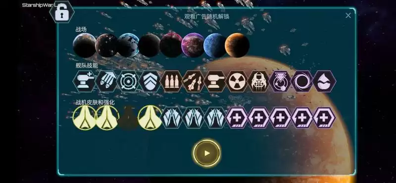 下面一排中间的是广告,可以通过看广告获得技能,可操控战机的皮肤,背景星球等