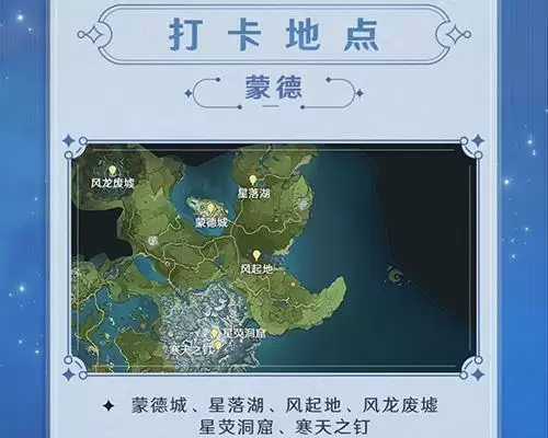 1、蒙德:蒙德城、星落湖、风起地、风龙废墟、星荧洞窟、寒天之钉。