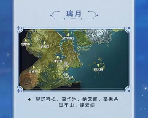 2、璃月:望舒客栈、禄华池、绝云间、采樵谷、琥牢山、孤云阁。