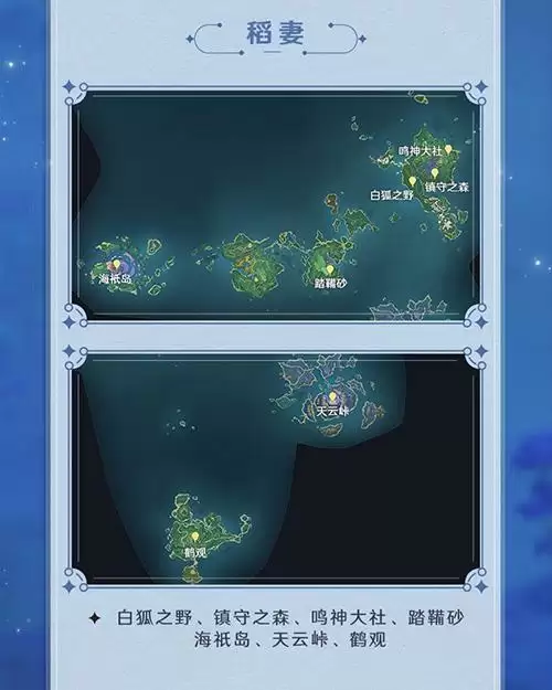 3、白狐之野、镇守之森、鸣神大社、踏错砂、海祇岛、天云咔、鹤观。