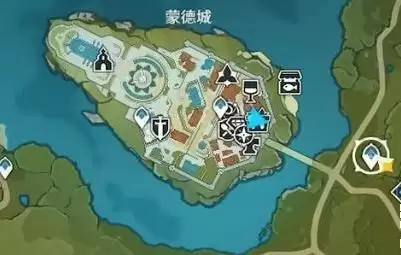 1、打开地图,找到蒙德城地区,我们前往下图的蓝色箭头位置