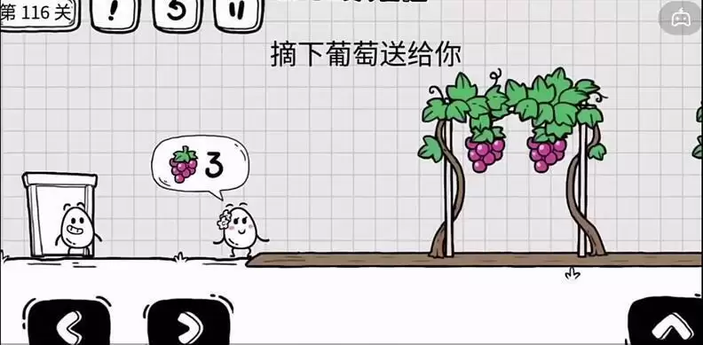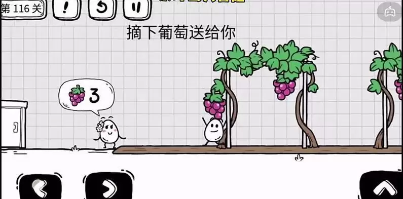 茶叶蛋大冒险第116关的通关提示“摘下葡萄给你”,这一关里女朋友想要三串葡萄,第三串葡萄后面藏着马蜂窝,那怎么躲避马蜂窝获取葡萄呢?一起来看看茶叶蛋大冒险116关通关攻略吧!