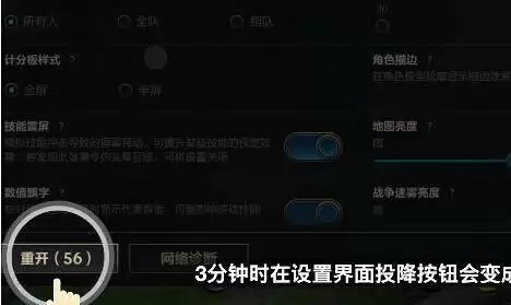 3、满足条件后,点击设置,在投降按键的地方,就会变成【重开】,点击以后需要队友投票同意