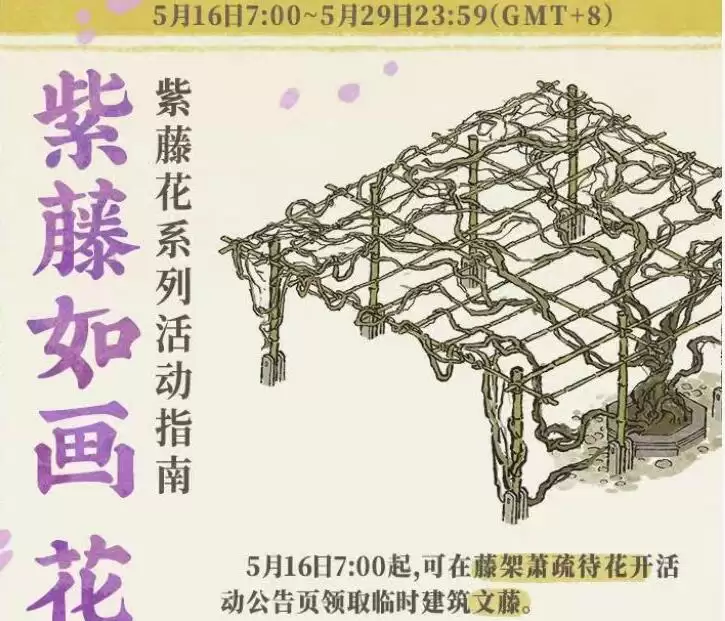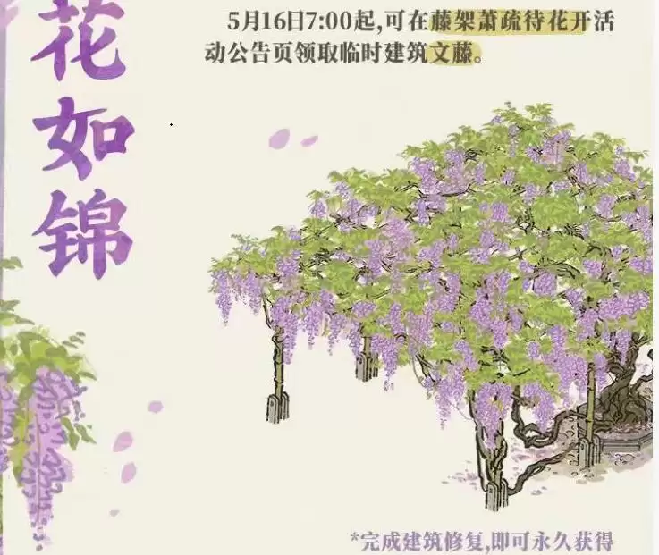 江南百景图最近在公告里面看到了一个非常好看的建筑,叫文藤,这个建筑一开始是一个枯草藤架,经过修复之后就可以让她开出紫色的花非常的好看,那么江南百景图文藤怎么获得呢?一起来看看吧!