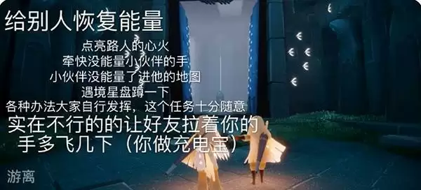 1、给别人恢复能量,点亮路人的心火牵快没能量小伙伴的手小伙伴没能量了进他的地图,遇境星盘蹲一下,各种办法大家自行发挥,这个任务十分随意。