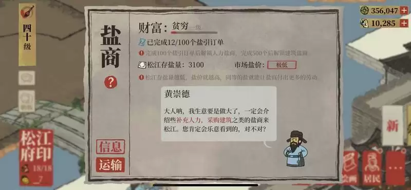4、因此在松江府我们需要多生产盐,让盐商去其他府交易
