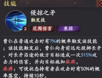 曹仁是这个阵容核心又是紫卡,卡池也容易出.技能自带最大生命值得护盾,释放技能后触发。