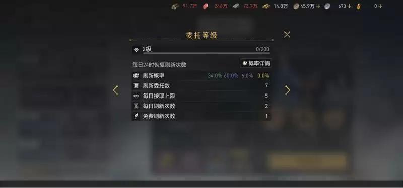 2.完成委托任务获得委托经验,可提升委托等级。委托等级越高,任务品质、任务刷新数量和可接取任务上限就越高。