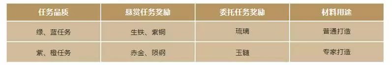 委托任务可分为派遣任务和悬赏任务。它们对应获得的打造材料也各不相同,如下表所示。领主可根据目标挂饰的材料需求,合理筹划任务类型的选择。