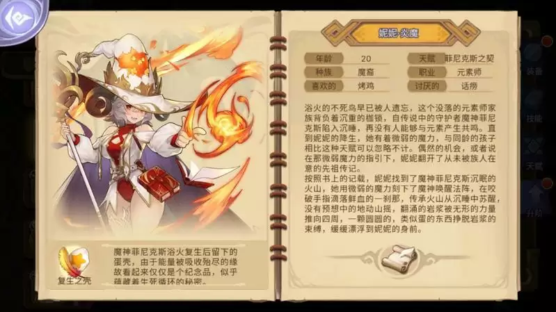 妮妮每回合可获得一张额外的不消耗能量且不占用回合的菲尼克斯熔火,需要消耗3只火灵释放;