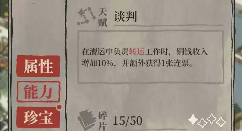 天赋:在漕运中负责转运工作时,铜钱收入增加10%,并额外获得1张连票。