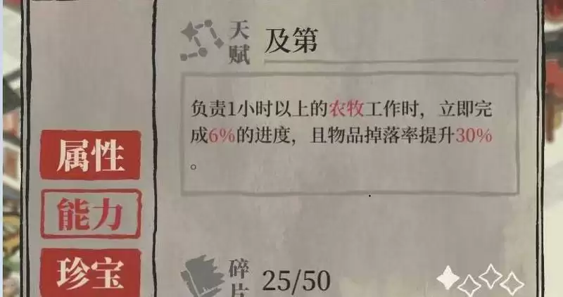 天赋:负责1小时以上的农牧工作时,立即完成6%的进度,且物品掉落率提升30%