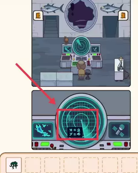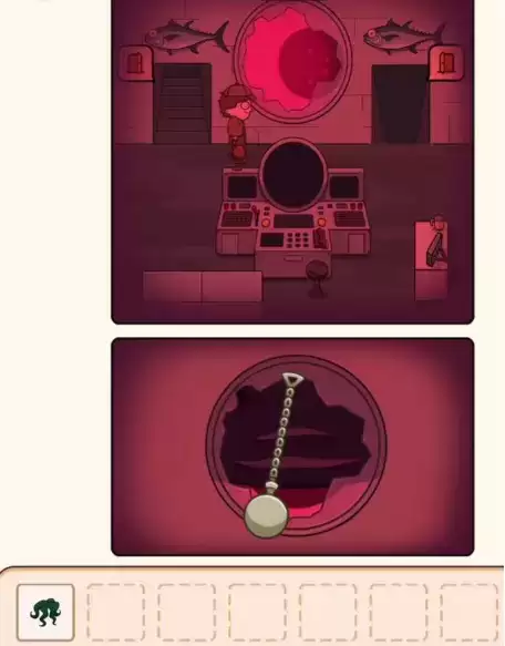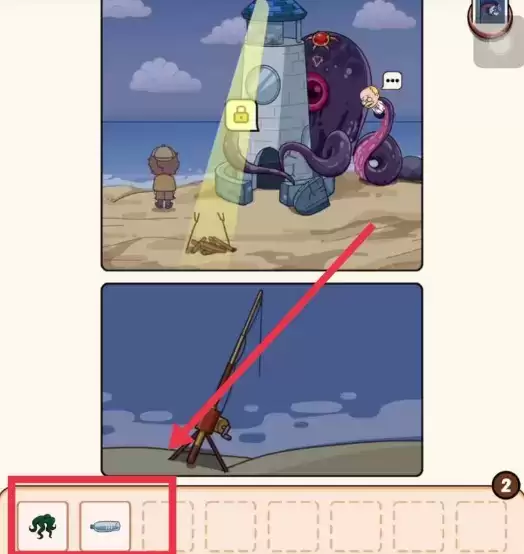 1.首先来到岸边,可以看见一根鱼竿,鱼竿会钓上来一个小章鱼和一个矿泉水瓶。