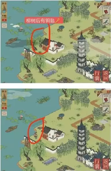 钥匙一,在这个居民房的后面,先将柳树砍掉才可以看到