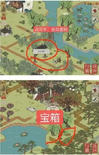 宝箱三,先去月老祠在一堆柳树下可以看到