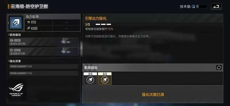 装甲方面我们加点选择:物理抗性提升+附加装甲。这样加点的话是比较常规的,在大多数情况都可以使用,可以极大的提升该战舰的生存空间,假设对方有较多的能量型武器,例如维塔斯这种能量型的轰炸机的话,我们可以将其中的一个附加装甲替换成能量抗性提升。