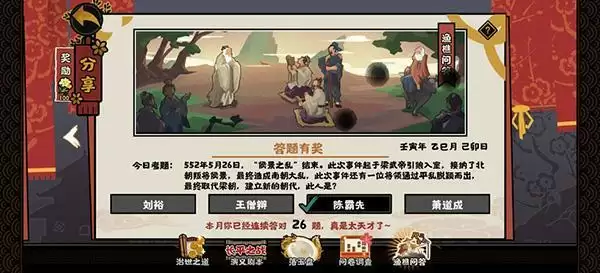 2022无悔华夏渔樵问答5月26日答案是什么,今日答题已经开启,在答案当中大家只需要选择陈霸先即可完成获得相应的奖励,那么今天的考题相关解析,感兴趣的玩家就一起来了解下吧。