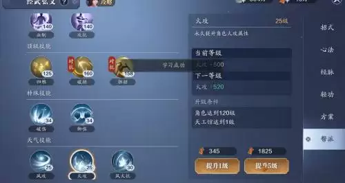 天气技能风攻、火攻、风火抗开放25~30级,共需5200点帮贡优先点满。