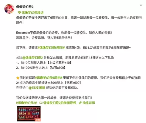 Ensemble不仅是偶像们的合奏,也是每一位转校生、制作人爱的合唱。LOVE篇全明星为玩家送上六周年寄语的同时,《偶像梦幻祭2》正式也在微博征集玩家对偶像们的寄语,更凸显出游戏和玩家的互相陪伴。