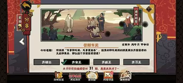 2022无悔华夏渔樵问答5月31日答案是什么,今天的考题问的是钟无艳说的某位齐国国君指的是谁,这道题相对来说就简单了很多,大家选择齐宣王就可以领取相应的奖励了。