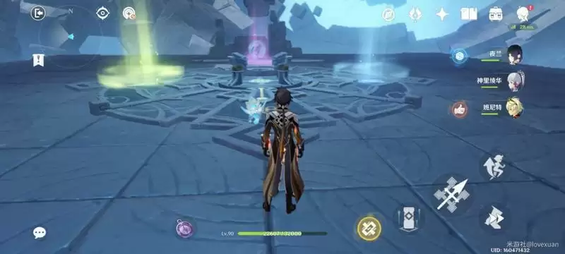 第二,当我们进入秘境后,有四个方向的光束需要我们解锁(眩晕警告),以我们进来的祭坛为中心,总之你一个方向转一圈会回到祭坛,我们每传送一个地方,地下都有字符,我们给自己套上盾之后把字符全部踩完,然后会出怪,把怪灭了,会有光束让你激活移动