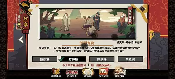 2022无悔华夏渔樵问答6月1日答案是什么,今天是61儿童节,考题自然也是和节日相关,在考题中问道在选项中哪一个不是哪吒的法宝,这道题也是非常简单,选择打神鞭就可以领取奖励了。