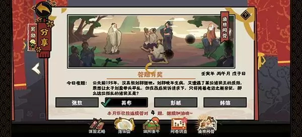 2022无悔华夏渔樵问答6月4日答案是什么,今日的渔樵问答主要问的是关于刘邦晚年生病时某位诸侯王进行了反叛,这位叛乱的诸侯王是谁,正确答案是英布,不知道各位小伙伴是否答对了呢。