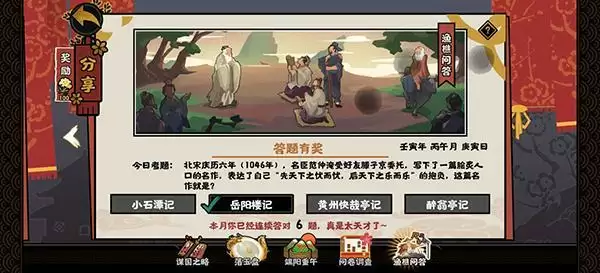 2022无悔华夏渔樵问答6月6日答案是什么,在今日的考题当中问的是“先天下之忧而忧,后天下之乐而乐”这句名作是出自于那篇名作,稍微有点印象的玩家应该都知道正确答案选择岳阳楼记,具体的内容一起来看下吧。