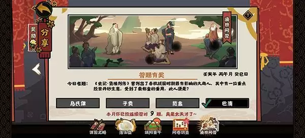 2022无悔华夏渔樵问答6月9日答案是什么,今日考题主要问的是在春秋战国时期又一位经营丹砂生意的人收到了秦始皇的重用,这人名叫什么,正确答案是巴清,下面我们就一起来了解下相关内容。