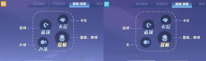 不过这里需要注意的是,不同职业的技能按键的位置会有一定的区别,比如:在玩家使用SG角色时,在篮板/地板的技能键上就会增加扑球的按键,而在使用SF角色时,在进攻持球的功能键上则没有改按键.