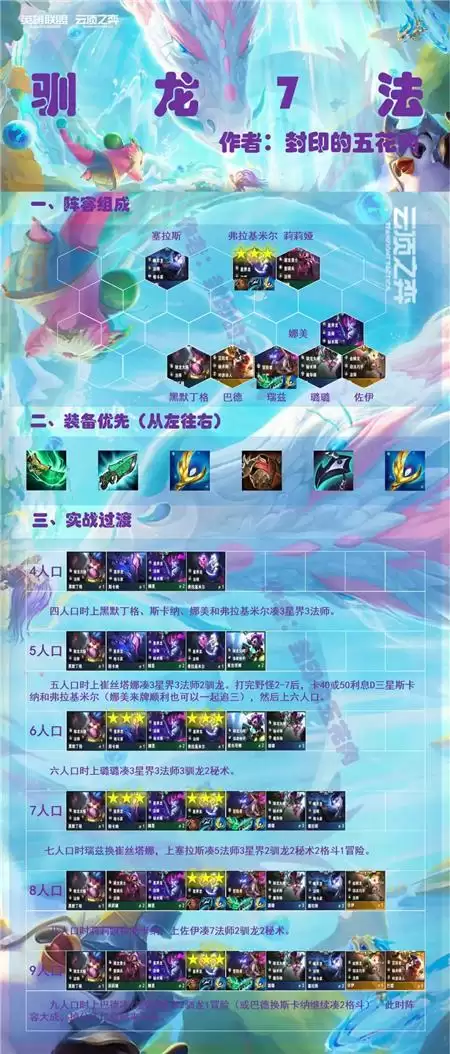 驯龙7法最终阵容由塞拉斯、弗拉基米尔、莉莉娅、黑默丁格、巴德、瑞兹、璐璐、娜美和佐伊组成7法师3秘术2驯龙1冒险。