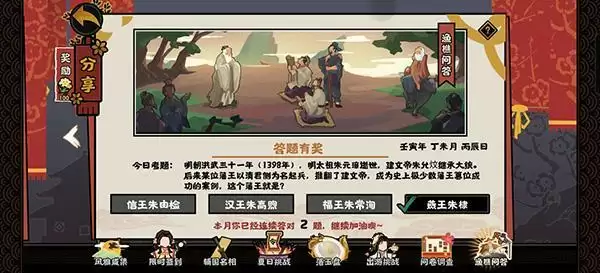 2022无悔华夏渔樵问答7月2日答案是什么,今日考题问的是在明朝洪武三十一年(1398年),谁以清君侧为名起兵推翻了建文帝,成为了藩王篡位成功案例,正确答案选择燕王朱棣,一起来看下具体内容吧。