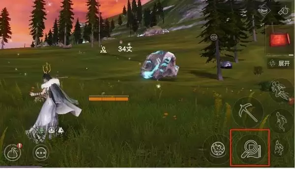 4.打开游戏内大地图,将右下角缩放调至100%,找到密卷地点对应的地名。到达附近后拿出密卷,点击技能按钮处【锄头图标】,可获得位置线索提示(“宝藏在你XX方向XX米”)。