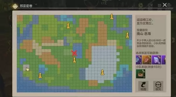 2.图中画“×”的地方即是邪巫藏身点,具体地点信息可以从右上方【宝藏就在XXX】进行查看。