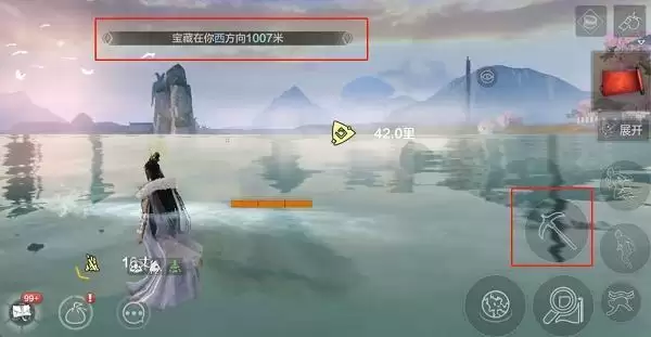 5.到达附近后点击“锄头按钮”挖掘,可获得位置线索提示