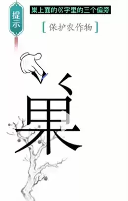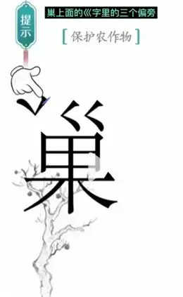1、这一关我们可以看到在果树上有一个大大的鸟巢,我们先点击“巢”字上方的偏旁“<”。