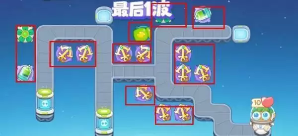 10.最后一波在快到萝卜的地方再加一个瓶子炮,这波兔子数量多,速度也快,能加炮就加,能升级就升级,提升火力,这样就能顺利满星通关了。
