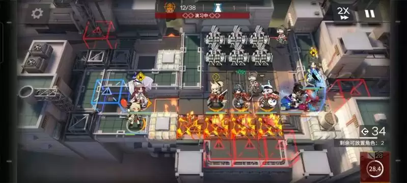依次部署桃金娘,羽毛笔,阿米娅↓(阿米娅位置在下图棘刺位置,技能好了就开打掉装甲后就换棘刺朝左)医疗←,小火龙→,最后2重装。