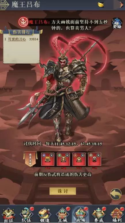 这个有点世界boss那味了,每天11点45,17点45各开启一次,清空吕布的血条即视为击杀boss,根据造成的伤害进行排名,排名最高可以拿100元宝,最低10元宝