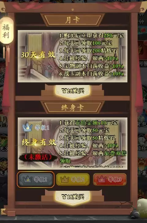 月卡每天可领取100元宝~终身卡每天可领取500元宝,这两张卡都是超值的,建议主公们安排上!