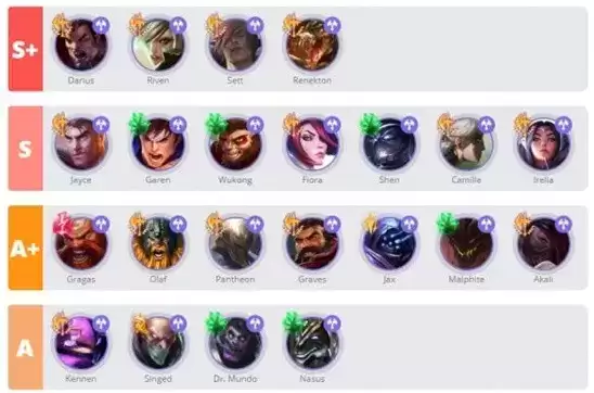 在上单位上,处于榜首的基本都是几个数值怪英雄。其中瑟提靠着一波小加强重新回来T1位置,四姐妹和杰斯慎等仍有一战之力。而被削弱过的狗头则是直接跌到了后排,同时一些对线期很难拿到镀层的英雄也被放到了榜尾的位置。